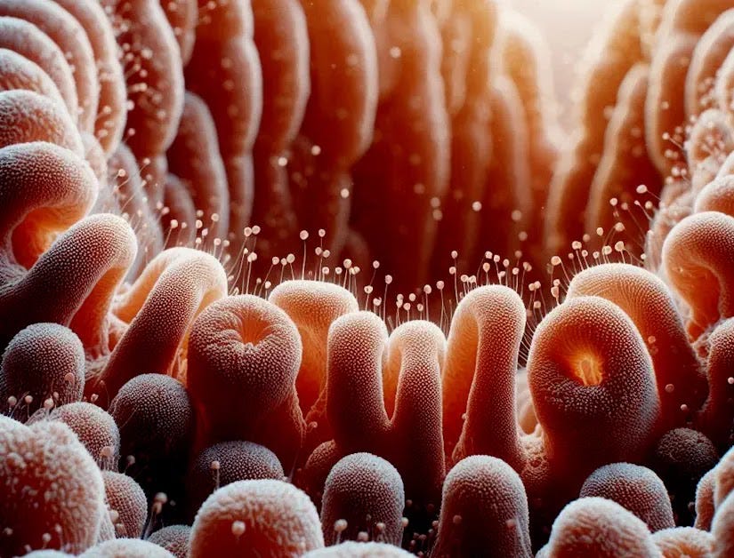 A healthy gut lining with visible villi (finger-like projections) for nutrient absorption.