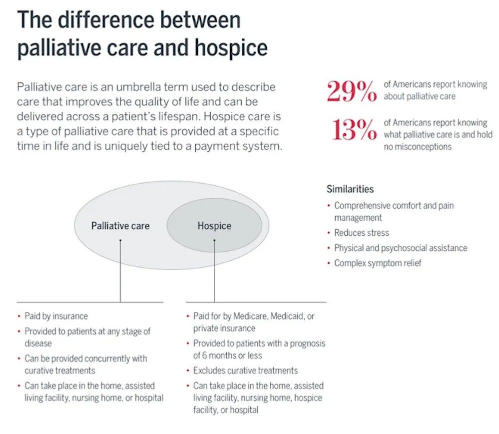 Diagram explaining how palliative care differs from hospice care, focusing on treatment goals and patient needs.