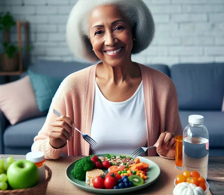 An older lady is savoring a healthy meal of fresh fruits, lean protein, and vegetables. She is avoiding malnutrition and has a water bottle to stay hydrated
