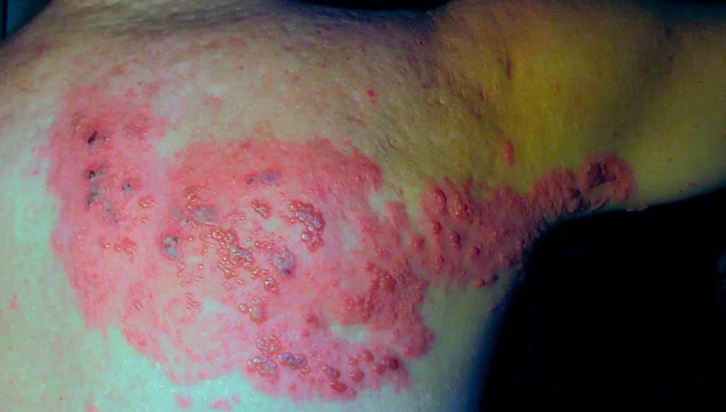 Fisle, CC BY-SA 3.0, via Wikimedia Commons The characteristic shingles rash, typically appears in a band on one side of the body with clusters of blisters. Early diagnosis and treatment are crucial for managing shingles.